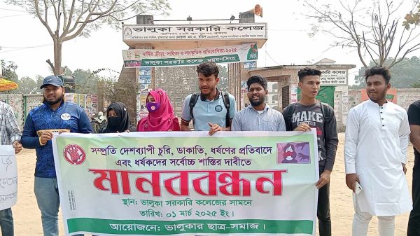 ময়মনসিংহের ভালুকায় সম্প্রতি দেশব্যাপী চুরি, ডাকাতি, ধর্ষণের প্রতিবাদে এবং ধর্ষকদের সর্বোচ্চ শাস্তির দাবিতে মানববন্ধন অনুষ্ঠিত হয়েছে। ভালুকার সাধারণ ছাত্র-সমাজ আয়োজনে ১ মার্চ (শনিবার) সকাল ১১ টায় ভালুকা সরকারি কলেজের সামনে