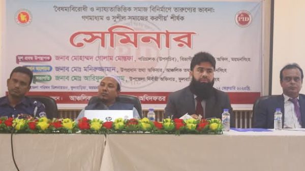 ময়মনসিংহের ফুলবাড়িয়ায় সাংবাদিক, শিক্ষক, বৈষম্যবিরোধী আন্দোলনের সমন্বয়কসহ বিভিন্ন শ্রেণী-পেশার মানুষের সাথে আঞ্চলিক তথ্য অফিস, ময়মনসিংহের সেমিনার অনুষ্ঠিত হয়েছে। বুধবার আঞ্চলিক তথ্য অফিস, ময়মনসিংহের আয়োজনে ‘বৈষম্যবিরোধী ও ন্যায্যতাভিত্তিক সমাজ বিনির্মাণে তারুণ্যের