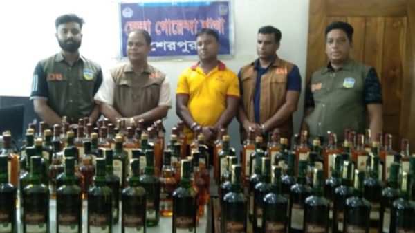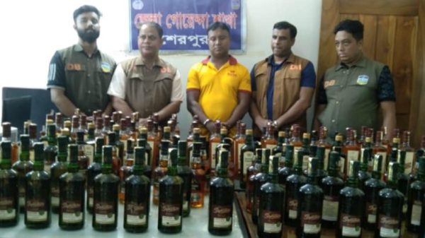 শেরপুরের নালিতাবাড়ী থেকে ডিবি পুলিশের অভিযান চালিয়ে ১৩৩ বোতল ভারতীয় মদসহ একজনকে গ্রেফতার করেছে। সোমবার ৮ জুলাই সকাল সাড়ে নয়টায় নালিতাবাড়ী উপজেলার সীমান্তঘেষা পোড়াগাও ইউনিয়নের ধোপাকুড়া বাজারে মাদক বিরোধী অভিযান