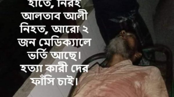 ময়মনসিংহ নগরীর ৩২ নং ওয়ার্ড চরকালিবাড়িতে (পীরবাড়ির সড়কে) স্থানীয় সন্ত্রাসী ও তাদের ভাড়াটিয়া বাহিনীর হাতে আলতাব আলী (৬১) নামে একজন নিহত হয়েছে। এ ঘটনায় আরো কয়েকজন আহত হয়েছেন। আহতদের মধ্যে