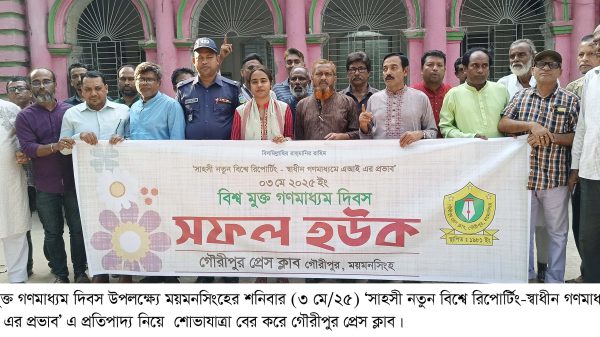 বিশ্ব মুক্ত গণমাধ্যম দিবস উপলক্ষ্যে স্বাধীন সাংবাদিকতার দাবিতে ময়মনসিংহের গৌরীপুরে র্যালী ও আলোচনা সভা করেছে কর্মরত সাংবাদিকরা। এ সময় সাংবাদিক সুরক্ষা আইন প্রণয়নসহ ১৪ দফা বাস্তবায়নের দাবি জানান তারা। শনিবার